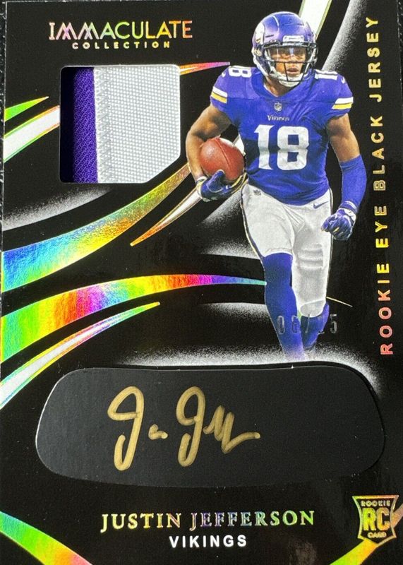 The Justin Jefferson 2020 Immaculate #REB-18 Immaculate Rookie Eye Black Jersey Autographs - Gold /25 card in Raw condition has not changed in price in the last 30 days and was last sold for $307.41 .