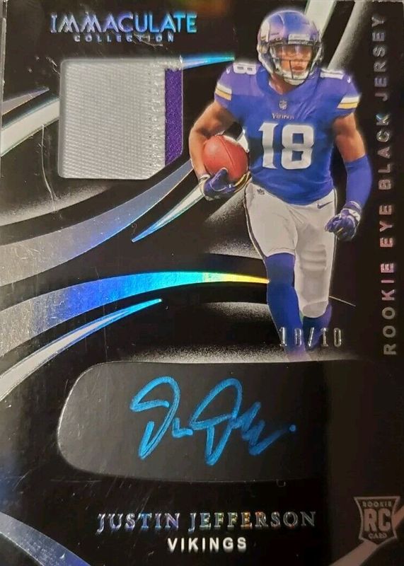 The Justin Jefferson 2020 Immaculate #REB-18 Immaculate Rookie Eye Black Jersey Autographs - Metallic /10 card in Raw condition has not changed in price in the last 30 days and was last sold for $273.00 .