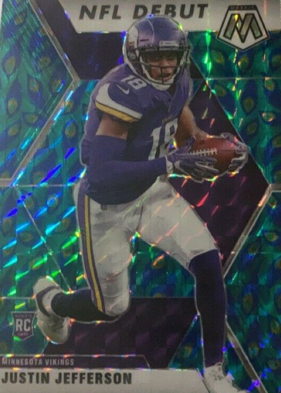 The Justin Jefferson 2020 Mosaic #270 NFL Debut - Choice Peacock /(SSP) Rookie card in Raw condition has not changed in price in the last 30 days and was last sold for $340.00 .