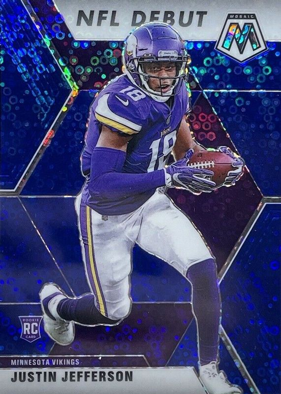 The Justin Jefferson 2020 Mosaic #270 NFL Debut - No Huddle Blue /75 Rookie card in Raw condition has not changed in price in the last 30 days and was last sold for $86.00 .