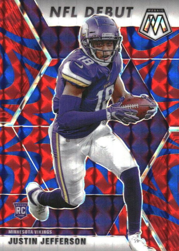 The Justin Jefferson 2020 Mosaic #270 NFL Debut - Reactive Blue Rookie card in Raw condition has not changed in price in the last 30 days and was last sold for $12.00 .