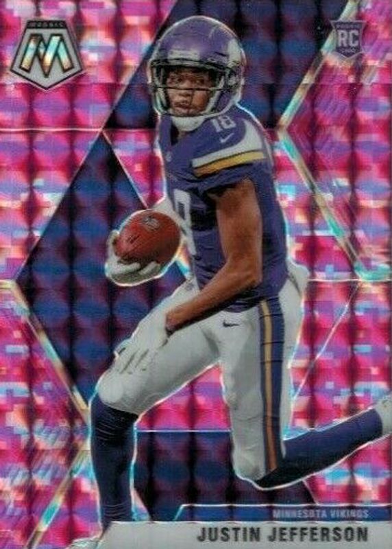 The Justin Jefferson 2020 Mosaic #209 Pink Camo Rookie card in Raw condition has moved up $0.01 (+0.1%) in the last 30 days and was last sold for $15.00 .