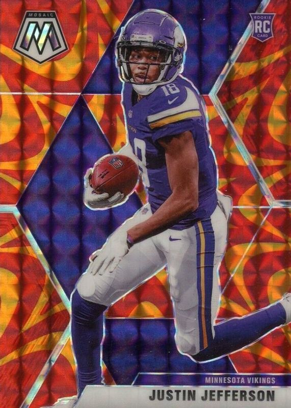 The Justin Jefferson 2020 Mosaic #209 Reactive Orange Rookie card in Raw condition has moved up $3.00 (+30.0%) in the last 30 days and was last sold for $13.00 .
