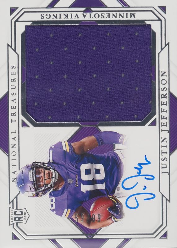 This card is 1 of 49 Justin Jefferson's card variations in the 2020 National Treasures set being tracked by Sports Card Investor, including Rookie Patch Auto /99, Rookie Patch Auto - Green Jersey Number (/18), Rookie Patch Auto - Holo Silver /25, Rookie Patch Auto - Midnight /20, and Rookie Patch Auto - Stars & Stripes /20.