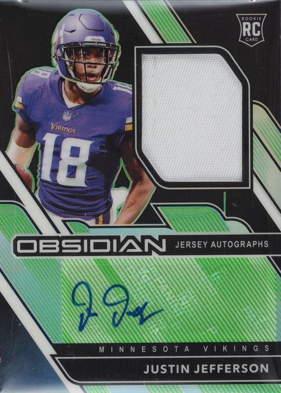 This card is 1 of 20 Justin Jefferson's card variations in the 2020 Obsidian set being tracked by Sports Card Investor, including Rookie Autographs (/150), Rookie Autographs - Electric Etch Green (/50), Rookie Autographs - Electric Etch Orange (/75), Rookie Autographs - Electric Etch Red (/10), and Rookie Autographs - Electric Etch Yellow (/25).