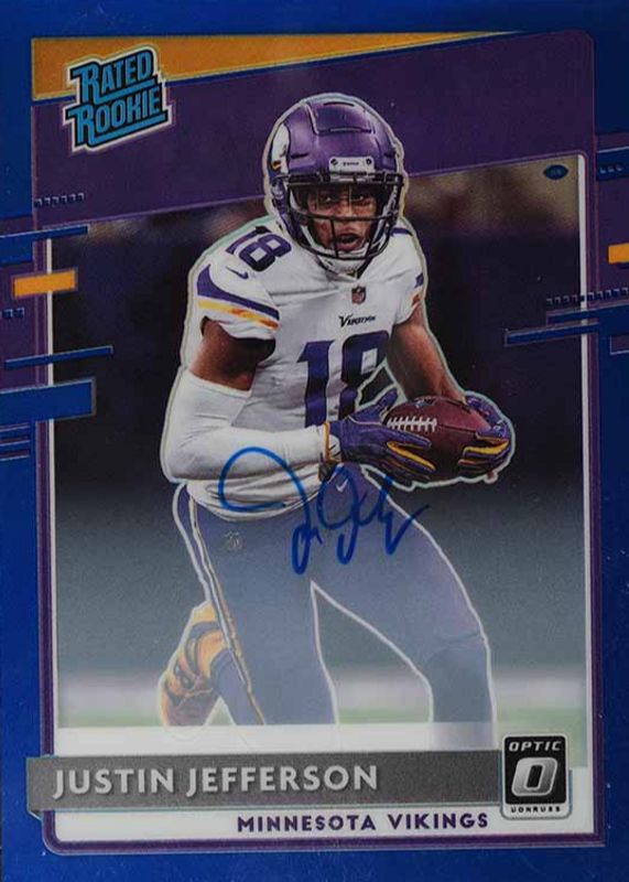The Justin Jefferson 2020 Optic #163 Rated Rookie Autographs - Blue /75 card in Raw condition has not changed in price in the last 30 days and was last sold for $625.00 .