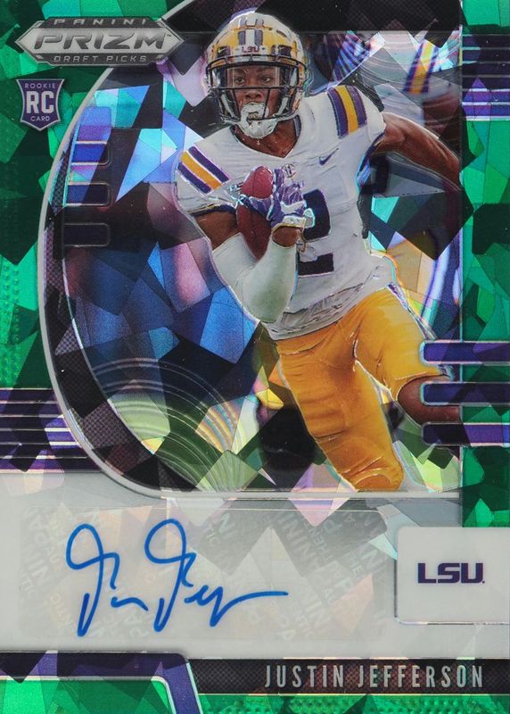 The Justin Jefferson 2020 Prizm Draft Picks #126 Autographs - Green Ice /18 Rookie card in Raw condition has not changed in price in the last 30 days and was last sold for $210.50 .