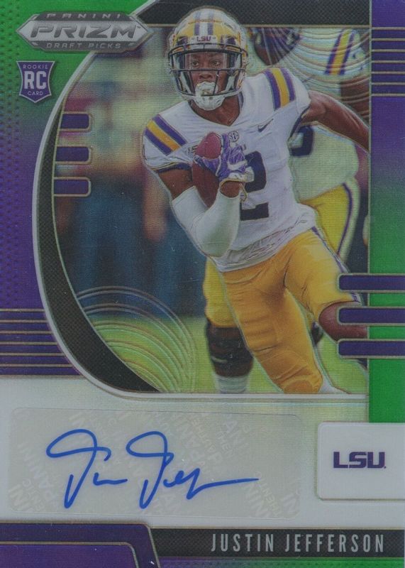 The Justin Jefferson 2020 Prizm Draft Picks #126 Autographs - Purple & Green (/199) Rookie card in Raw condition has not changed in price in the last 30 days and was last sold for $100.00 .