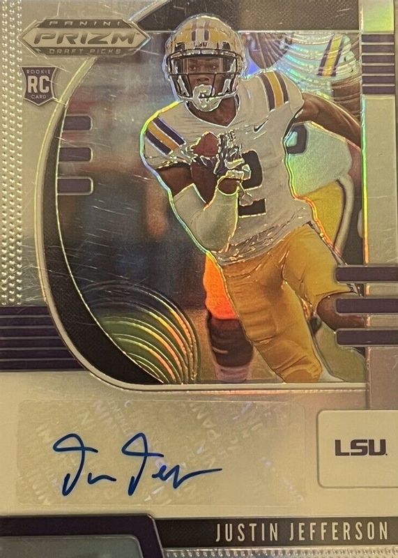 The Justin Jefferson 2020 Prizm Draft Picks #126 Autographs - Silver Rookie card in Raw condition has moved down -$15.00 (-12.0%) in the last 30 days and was last sold for $110.00 .