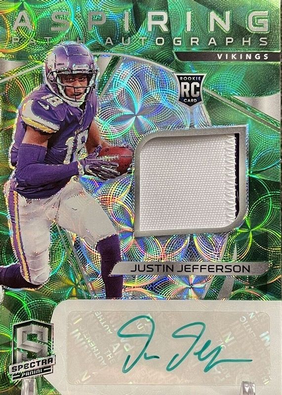 The Justin Jefferson 2020 Spectra #7 Aspiring Patch Autographs - Neon Green (/35) Rookie card in Raw condition has not changed in price in the last 30 days and was last sold for $200.00 .