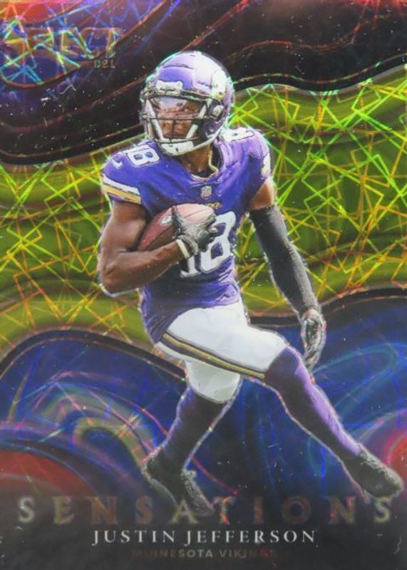 This card is 1 of 27 Justin Jefferson's card variations in the 2021 Select set being tracked by Sports Card Investor, including Artistic Selections /(SSP), Phenomenon - Zebra /(SSP), Select Numbers - Zebra /(SSP), Sensations - Zebra /(SSP), and Snapshots - Zebra /(SSP).