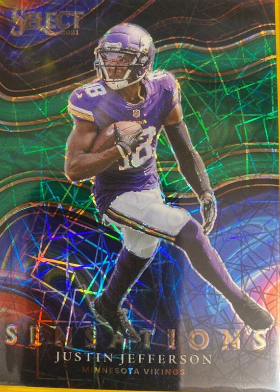 This card is 1 of 27 Justin Jefferson's card variations in the 2021 Select set being tracked by Sports Card Investor, including Artistic Selections /(SSP), Phenomenon - Zebra /(SSP), Select Numbers - Zebra /(SSP), Sensations - Zebra /(SSP), and Snapshots - Zebra /(SSP).