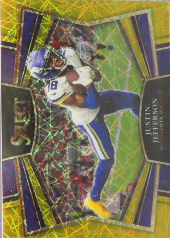 This card is 1 of 27 Justin Jefferson's card variations in the 2021 Select set being tracked by Sports Card Investor, including Artistic Selections /(SSP), Phenomenon - Zebra /(SSP), Select Numbers - Zebra /(SSP), Sensations - Zebra /(SSP), and Snapshots - Zebra /(SSP).