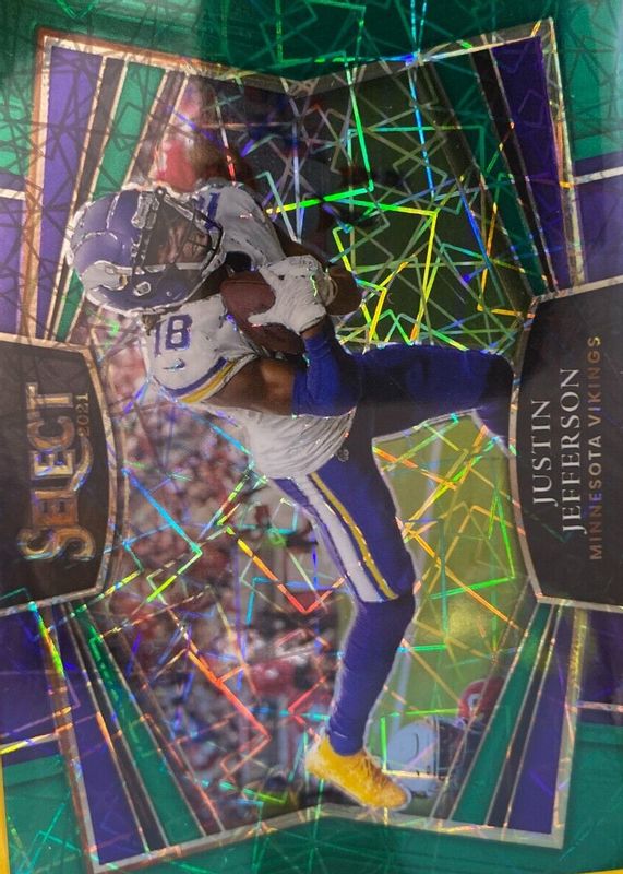 This card is 1 of 27 Justin Jefferson's card variations in the 2021 Select set being tracked by Sports Card Investor, including Artistic Selections /(SSP), Phenomenon - Zebra /(SSP), Select Numbers - Zebra /(SSP), Sensations - Zebra /(SSP), and Snapshots - Zebra /(SSP).