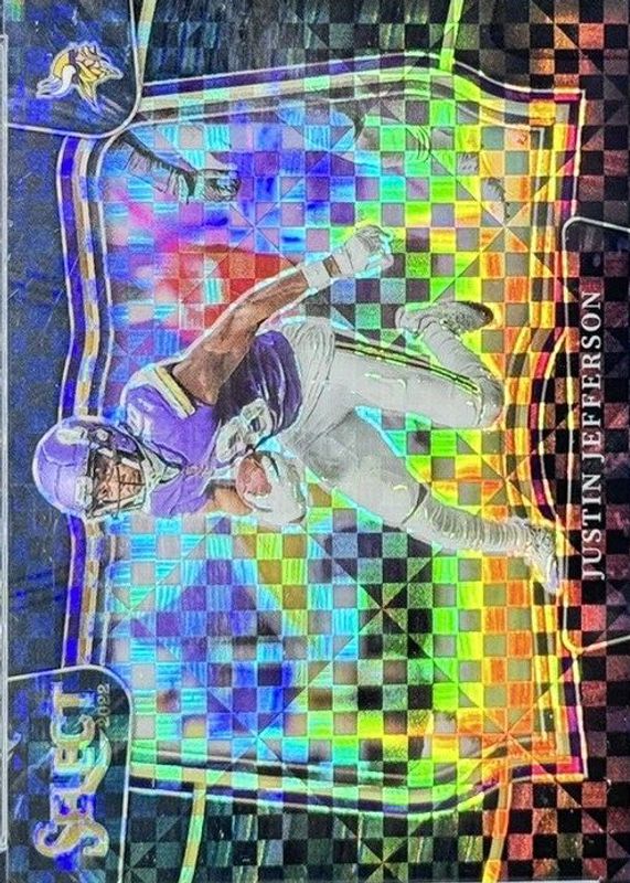 This card is 1 of 34 Justin Jefferson's card variations in the 2022 Select set being tracked by Sports Card Investor, including Field Level Cosmic /(SSP), Field Level Tiger /(SSP), Field Level Zebra /(SSP), Field Level Tie-Dye /25, and Field Level Gold /10.