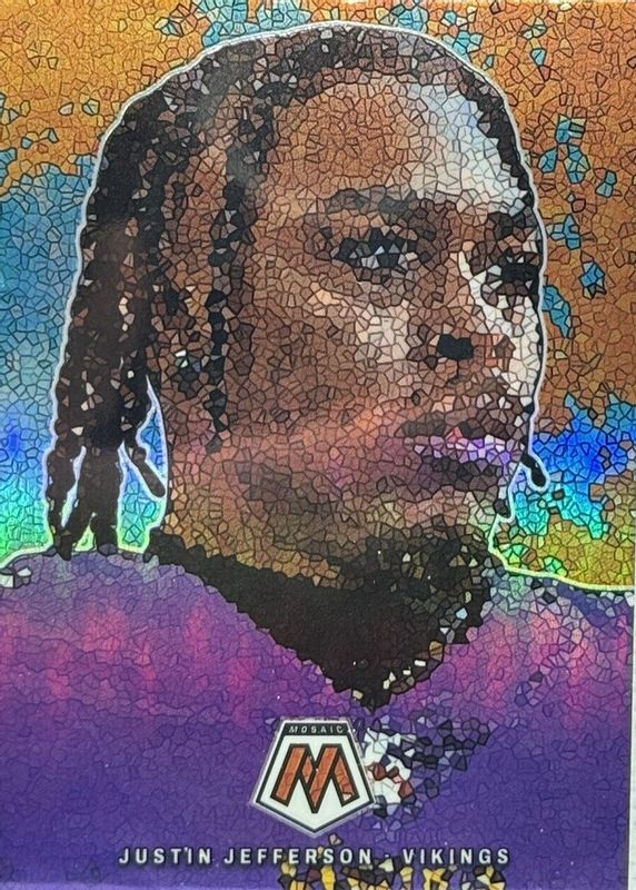 The Justin Jefferson 2023 Mosaic #MM-16 Micro Mosaic /(SSP) card in Raw condition has moved up $50.85 (+33.9%) in the last 30 days and was last sold for $200.85 .