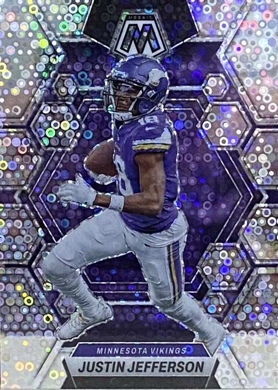 This card is 1 of 41 Justin Jefferson's card variations in the 2023 Mosaic set being tracked by Sports Card Investor, including Choice Red & Green, Green, Pink Camo, Reactive Blue, and Reactive Yellow.