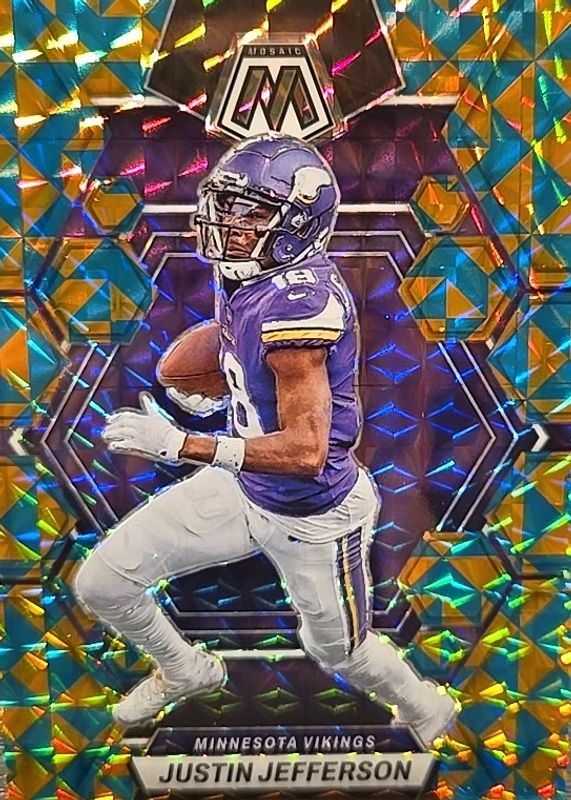 This card is 1 of 41 Justin Jefferson's card variations in the 2023 Mosaic set being tracked by Sports Card Investor, including Choice Red & Green, Green, No Huddle, Pink Camo, and Reactive Blue.