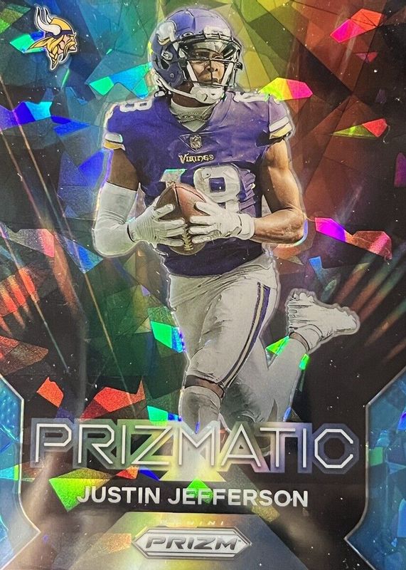 The Justin Jefferson 2023 Prizm #16 Prizmatic - Blue Ice /99 card in Raw condition has moved up $14.00 (+400%) in the last 30 days and was last sold for $17.50 .