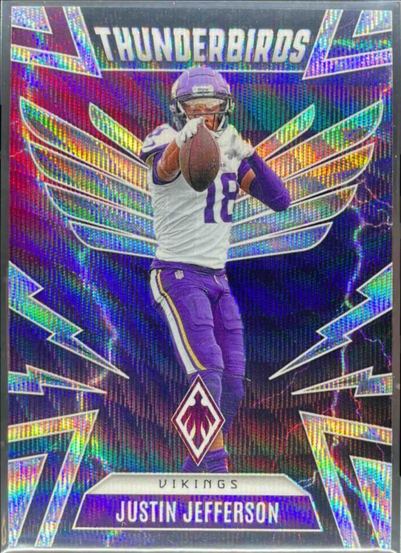 The Justin Jefferson 2025 Phoenix #34 Thunderbirds - Wave /299 card is 1 of 141 Justin Jefferson's card variations in the 2025 Phoenix set being tracked by Sports Card Investor, including Base, Silver, Silver Hyper, Silver Lava, and Silver Lazer.