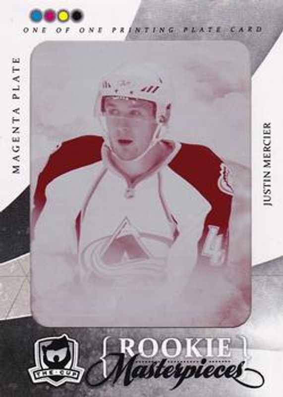 The Justin Mercier 2010 Upper Deck The Cup #ART-108 Printing Plates Artifacts Magenta /1 Rookie card is 1 of 24 Justin Mercier's card variations in the 2010 Upper Deck The Cup set being tracked by Sports Card Investor, including Base /199, Gold /25, Gold Rainbow /25, Black /1, and Printing Plates Black /1.