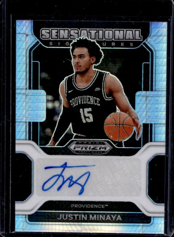 The Justin Minaya 2022 Prizm Draft Picks #SS-JMI Sensational Signatures - Hyper card is 1 of 22 Justin Minaya's card variations in the 2022 Prizm Draft Picks set being tracked by Sports Card Investor, including Sensational Signatures, Sensational Signatures - Green, Sensational Signatures - Silver, Sensational Signatures - Red /199, and Sensational Signatures - Blue /149.