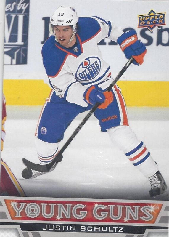 This card is 1 of 5 Justin Schultz's card variations in the 2013 Upper Deck set being tracked by Sports Card Investor, including Young Guns Base, Young Guns - Acetate, Young Guns - UD Exclusives /100, and Young Guns - UD High Gloss /10.