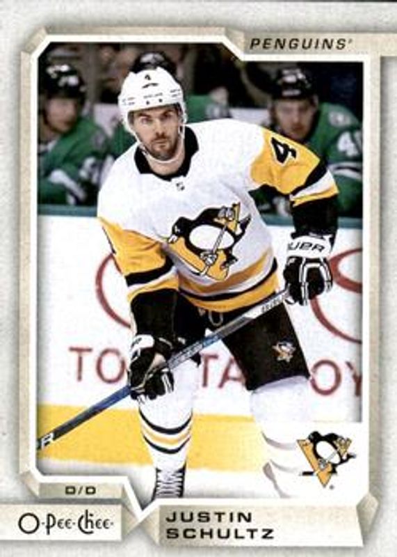 The Justin Schultz 2018 O-Pee-Chee #392 Base card is 1 of 9 Justin Schultz's card variations in the 2018 O-Pee-Chee set being tracked by Sports Card Investor, including Gold Border Glossy, Retro, Retro Blank Back, Retro No Name Scratch Off, and Silver.