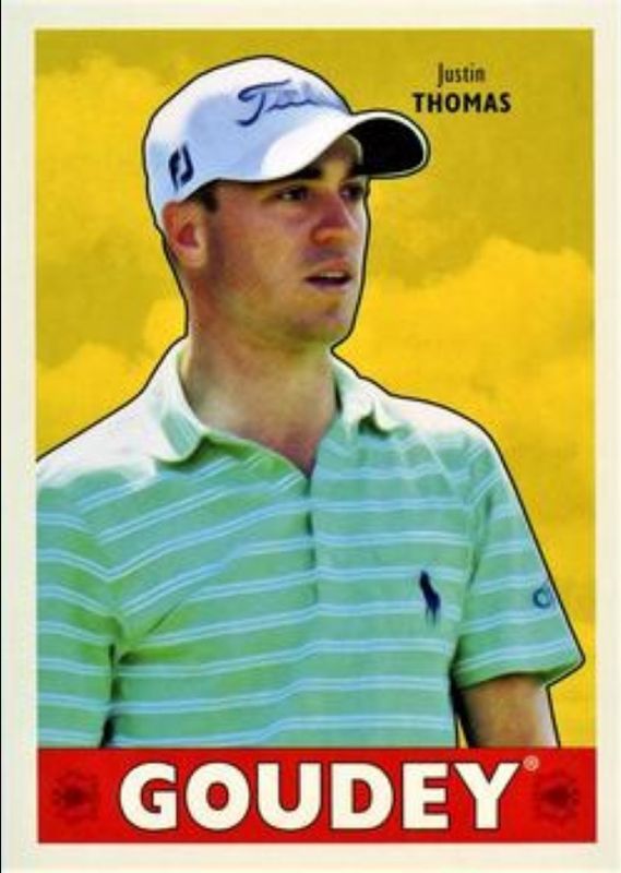 The Justin Thomas 2016 Upper Deck Goodwin Champions #14 Goudey card is 1 of 56 Justin Thomas' card variations in the 2016 Upper Deck Goodwin Champions set being tracked by Sports Card Investor, including #68 Base, #146 Base, #18 Base, Canvas Blank Back Minis, and #146 Canvas Minis.