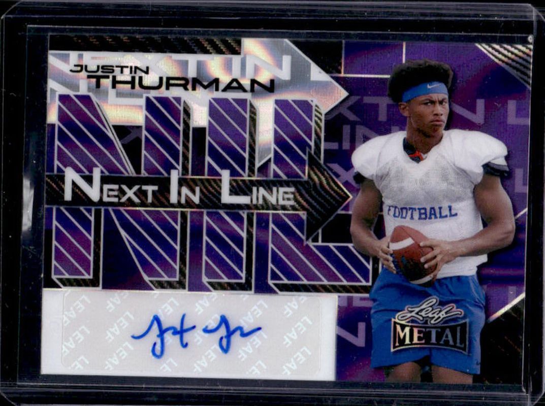 The Justin Thurman 2025 Leaf Metal #NL-JT3 Next in Line - Lava Purple /7 card is 1 of 145 Justin Thurman's card variations in the 2025 Leaf Metal set being tracked by Sports Card Investor, including 92 Leaf LGR Autographs - Prismatic Silver /25, Next In Line - Prismatic Silver /25, So Money! - Prismatic Silver /25, 92 Leaf LGR Autographs - Prismatic Blue /20, and Next In Line - Prismatic Blue /20.