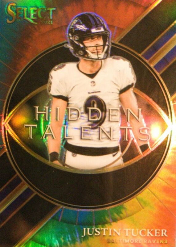 This card is 1 of 7 Justin Tucker's card variations in the 2021 Select set being tracked by Sports Card Investor, including Hidden Talents - Silver, Hidden Talents - Zebra /(SSP), Hidden Talents - Gold /10, Hidden Talents - Green /5, and Hidden Talents - Green & Black Snakeskin /2.
