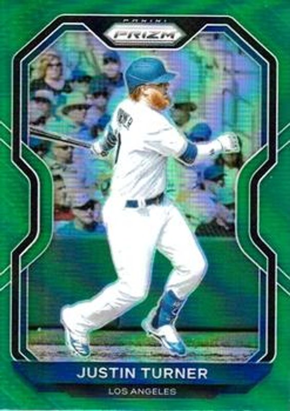 The Justin Turner 2021 Prizm #5 Green card is 1 of 52 Justin Turner's card variations in the 2021 Prizm set being tracked by Sports Card Investor, including Blue, Blue Velocity, Carolina Blue, Cosmic Haze, and Giraffe.