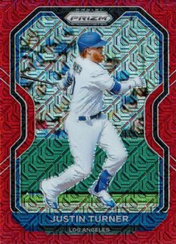 The Justin Turner 2021 Prizm #5 Red Mojo /149 card is 1 of 52 Justin Turner's card variations in the 2021 Prizm set being tracked by Sports Card Investor, including Blue, Blue Velocity, Carolina Blue, Cosmic Haze, and Giraffe.