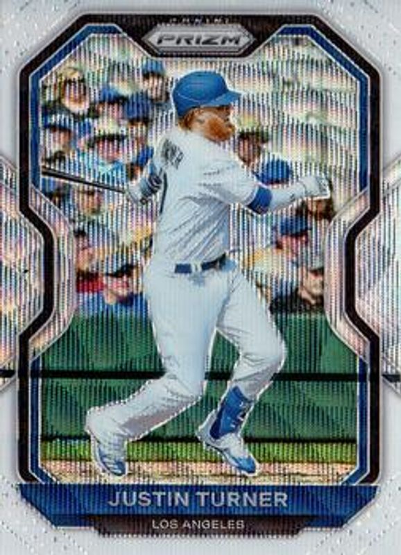 The Justin Turner 2021 Prizm #5 White Wave card is 1 of 52 Justin Turner's card variations in the 2021 Prizm set being tracked by Sports Card Investor, including Blue, Blue Velocity, Carolina Blue, Cosmic Haze, and Giraffe.