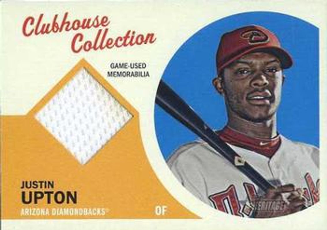 The Justin Upton 2012 Topps Heritage #CCR-JU Clubhouse Collection Relics card is 1 of 5 Justin Upton's card variations in the 2012 Topps Heritage set being tracked by Sports Card Investor, including #481a Base, #481b Base, #26 Stick Ons, and #ISR-JU Image Swap Variation Relics /63.