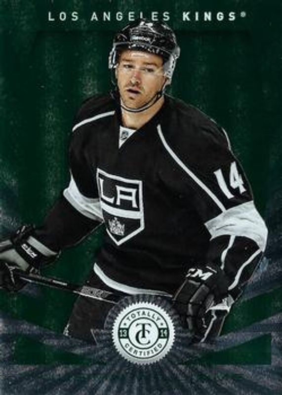 The Justin Williams (NHL) 2013 Totally Certified #123 Platinum Green /5 card is 1 of 14 Justin Williams (NHL)'s card variations in the 2013 Totally Certified set being tracked by Sports Card Investor, including Base, Platinum Red /100, Platinum Blue /50, Mirror Platinum Purple /35, and Mirror Platinum Red /25.