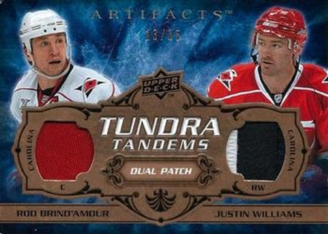 The Justin Williams / Rod Brind Amour 2008 Upper Deck Artifacts #TT-WB Tundra Tandems Patches Copper /35 card is 1 of 9 Justin Williams / Rod Brind Amour's card variations in the 2008 Upper Deck Artifacts set being tracked by Sports Card Investor, including Tundra Tandems /100, Tundra Tandems Bronze /75, Tundra Tandems - Silver /50, Tundra Tandems - Gold /25, and Tundra Tandems Patches - Silver /10.