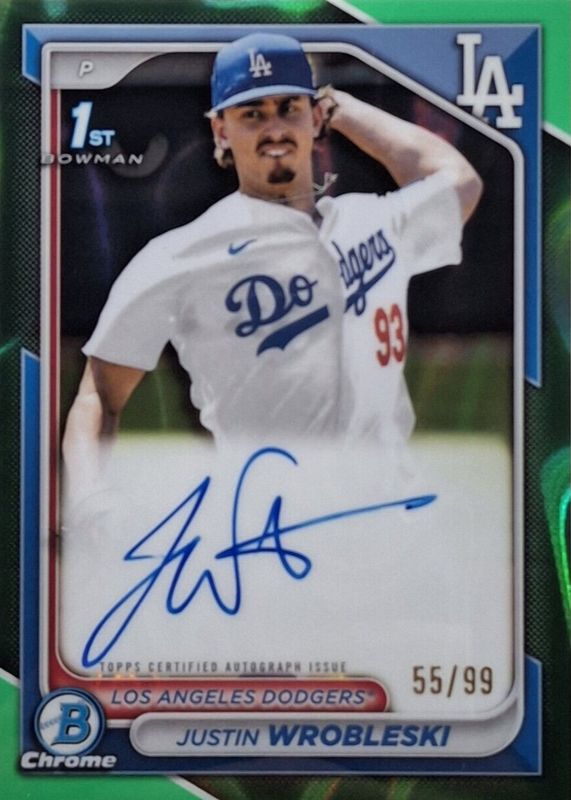 Best Prices Available For Sale of Justin Wrobleski 2024 Bowman Chrome #CPA-JWR Prospect Auto - Green Refractor /99 (1st)