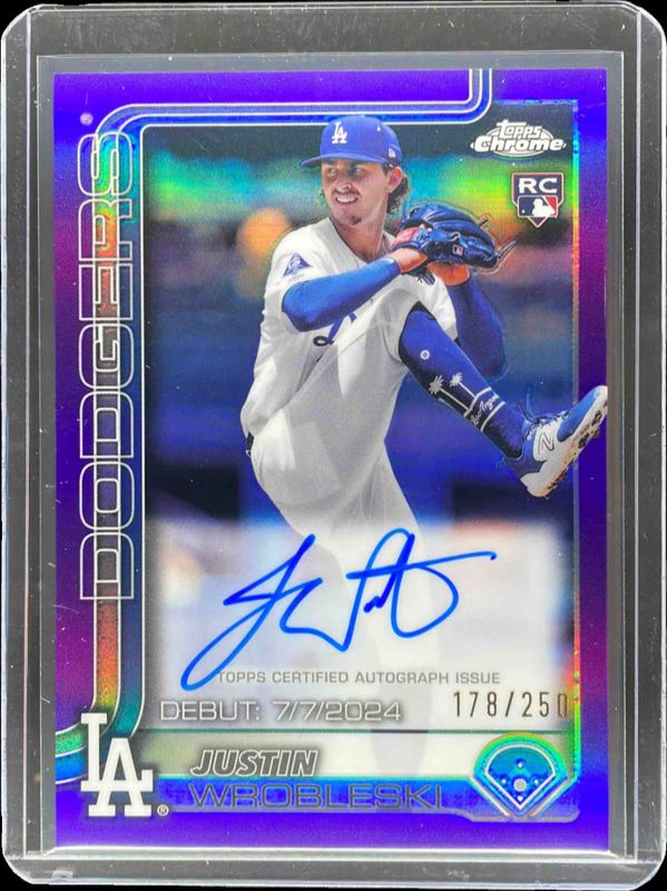 The Justin Wrobleski 2025 Topps Chrome Update #CRDA-JW Rookie Debut Autographs - Purple Refractor /250 card is 1 of 29 Justin Wrobleski's card variations in the 2025 Topps Chrome Update set being tracked by Sports Card Investor, including Rookie Debut Autographs, Rookie Debut Autographs - Black & White Mini-Diamond Refractor, Rookie Lava Lamp Autographs, Rookie Debut Autographs - Refractor /499, and Rookie Debut Autographs - Purple Speckle Refractor /299.