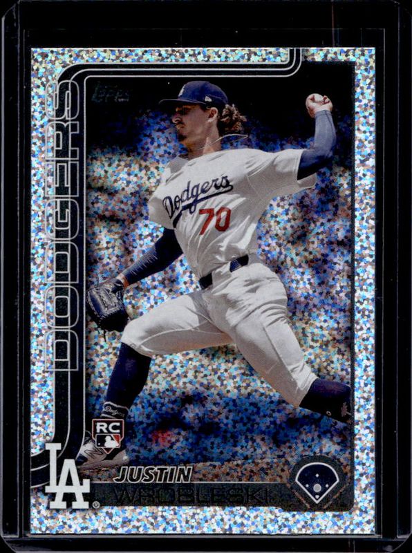 The Justin Wrobleski 2025 Topps #204 Confetti Rookie card is 1 of 115 Justin Wrobleski's card variations in the 2025 Topps set being tracked by Sports Card Investor, including Base, Aqua Holo Foil, Diamante Foil, Holo Foil, and Pink Diamante Foil.