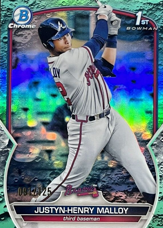The Justyn-Henry Malloy 2023 Bowman #BCP-51 Chrome Prospects - Aqua Lunar Crater Refractor /125 (1st) card in Raw condition has not changed in price in the last 30 days and was last sold for $6.00 .