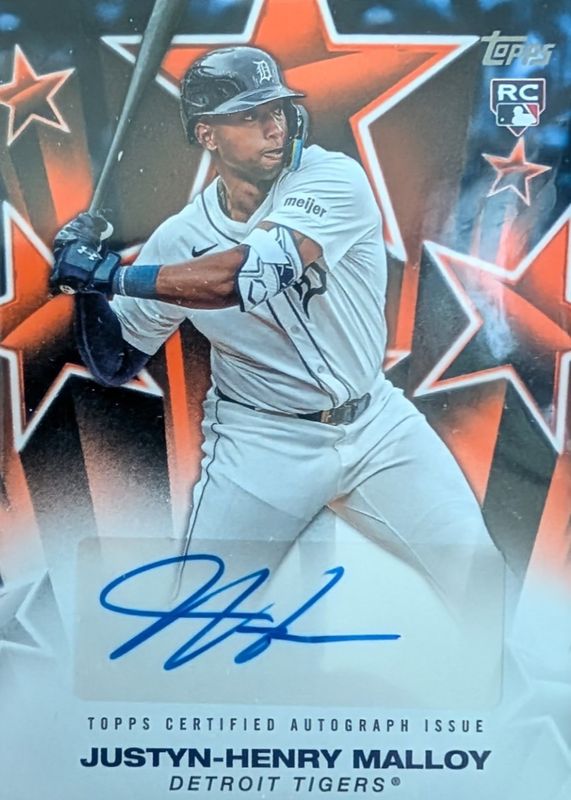 The Justyn-Henry Malloy 2025 Topps #BSA-JHM Baseball Stars Autographs - Orange /25 Rookie card in Raw condition has not changed in price in the last 30 days and was last sold for $10.61 .