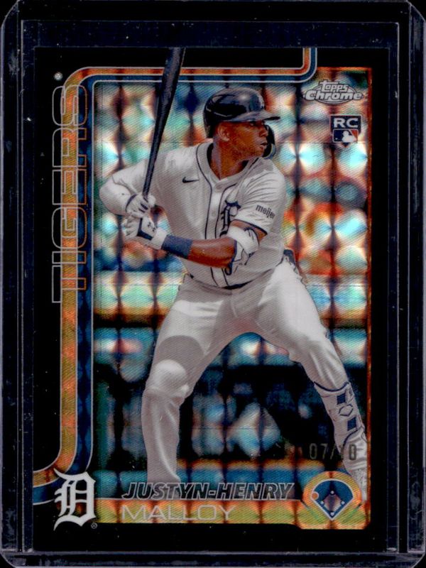 The Justyn-Henry Malloy 2025 Topps Chrome #224 Black Geometric Refractor /10 Rookie card is 1 of 91 Justyn-Henry Malloy's card variations in the 2025 Topps Chrome set being tracked by Sports Card Investor, including Base, Geometric Refractor, Lightboard Logo Variation, Negative Refractor, and Prism Refractor.