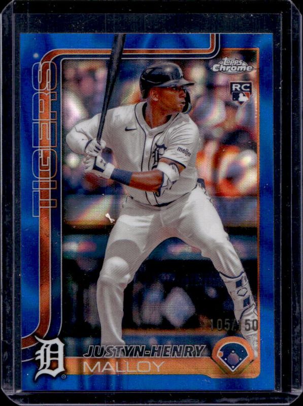 The Justyn-Henry Malloy 2025 Topps Chrome #224 Blue Lava Refractor /150 Rookie card is 1 of 91 Justyn-Henry Malloy's card variations in the 2025 Topps Chrome set being tracked by Sports Card Investor, including Base, Geometric Refractor, Lightboard Logo Variation, Negative Refractor, and Prism Refractor.