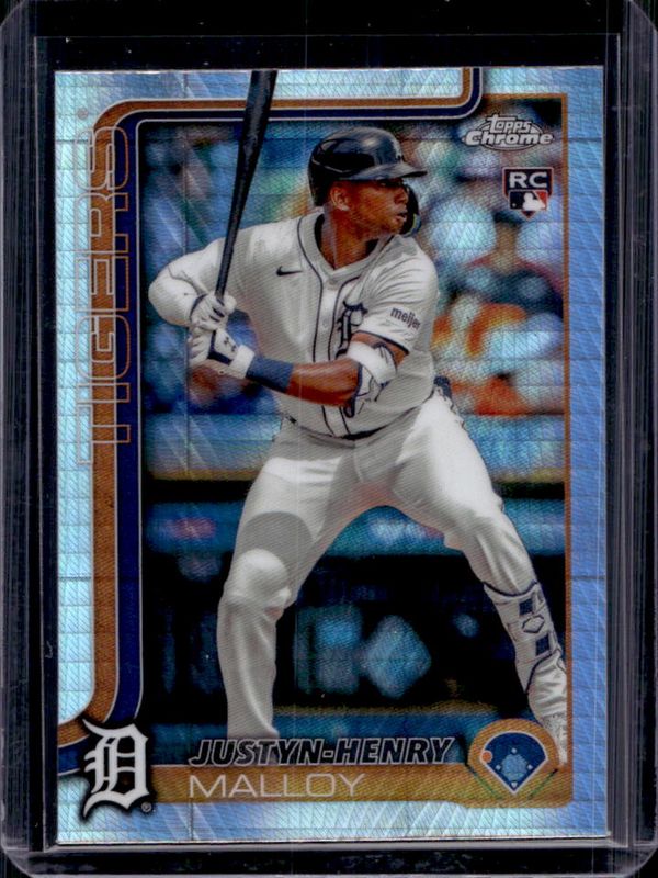 The Justyn-Henry Malloy 2025 Topps Chrome #224 Prism Refractor Rookie card is 1 of 91 Justyn-Henry Malloy's card variations in the 2025 Topps Chrome set being tracked by Sports Card Investor, including Base, Geometric Refractor, Lightboard Logo Variation, Negative Refractor, and RayWave Refractor.