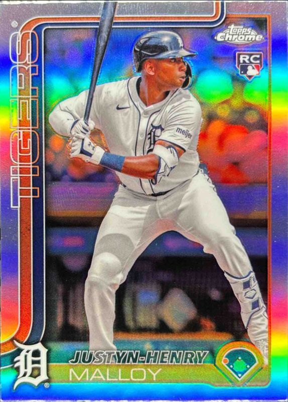 The Justyn-Henry Malloy 2025 Topps Chrome #224 Refractor Rookie card is 1 of 91 Justyn-Henry Malloy's card variations in the 2025 Topps Chrome set being tracked by Sports Card Investor, including Base, Geometric Refractor, Lightboard Logo Variation, Negative Refractor, and Prism Refractor.