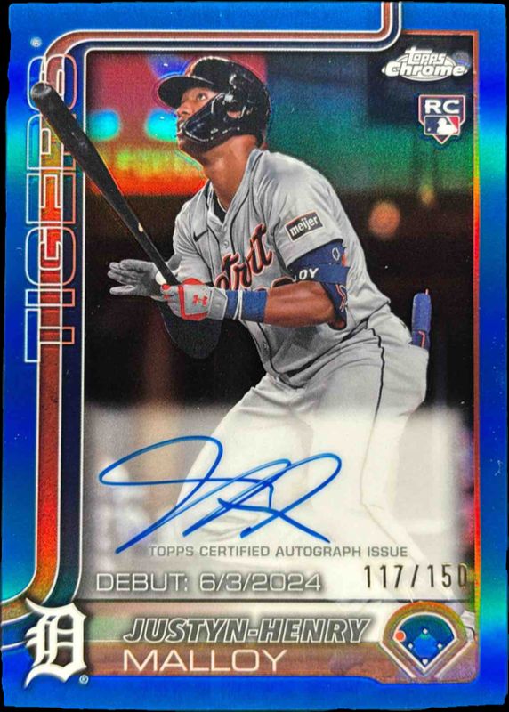 The Justyn-Henry Malloy 2025 Topps Chrome Update #CRDA-JM Rookie Debut Autographs - Blue Refractor /150 card is 1 of 29 Justyn-Henry Malloy's card variations in the 2025 Topps Chrome Update set being tracked by Sports Card Investor, including Rookie Debut Autographs, Rookie Debut Autographs - Black & White Mini-Diamond Refractor, Rookie Lava Lamp Autographs, Rookie Debut Autographs - Refractor /499, and Rookie Debut Autographs - Purple Speckle Refractor /299.