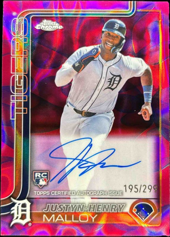The Justyn-Henry Malloy 2025 Topps Chrome Update #RA-JM Rookie Lava Lamp Autographs - Magenta Purple Refractor /299 card is 1 of 29 Justyn-Henry Malloy's card variations in the 2025 Topps Chrome Update set being tracked by Sports Card Investor, including Rookie Debut Autographs, Rookie Debut Autographs - Black & White Mini-Diamond Refractor, Rookie Lava Lamp Autographs, Rookie Debut Autographs - Refractor /499, and Rookie Debut Autographs - Purple Speckle Refractor /299.