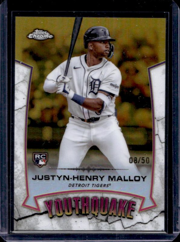 The Justyn-Henry Malloy 2025 Topps Chrome #YQ-19 Youthquake - Gold Refractor /50 Rookie card is 1 of 91 Justyn-Henry Malloy's card variations in the 2025 Topps Chrome set being tracked by Sports Card Investor, including Base, Geometric Refractor, Lightboard Logo Variation, Negative Refractor, and Prism Refractor.