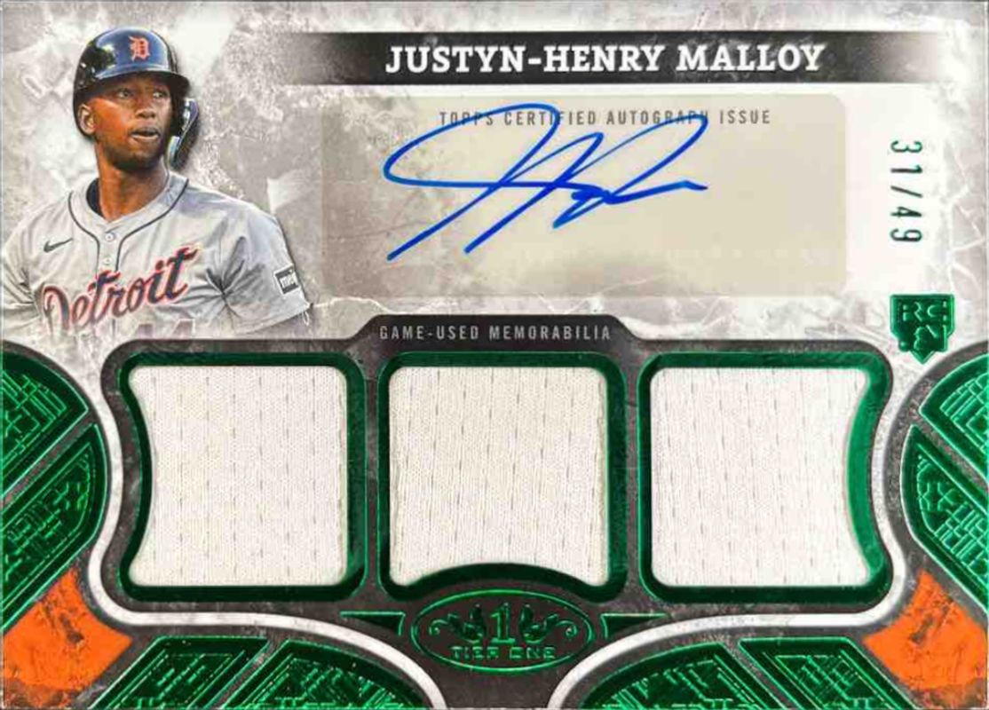 The Justyn-Henry Malloy 2025 Topps Tier One #AT1R-JM Autographed Tier One Relics - Triple /40 Rookie card is 1 of 29 Justyn-Henry Malloy's card variations in the 2025 Topps Tier One set being tracked by Sports Card Investor, including Base Tier 3, Base Tier 3 - Bronze Foil, Break Out Autographs, Base Tier 3 Autographs /199, and Base Tier 3 - Blue Foil /125.